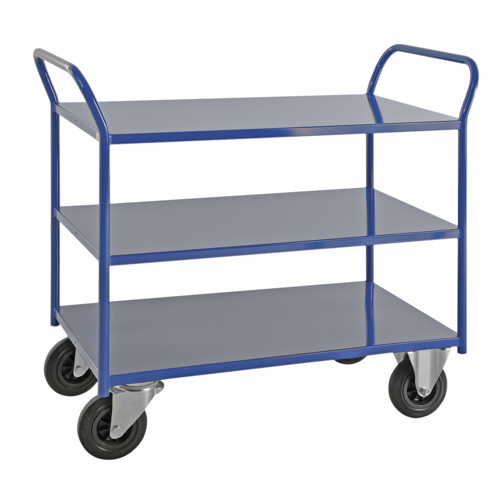 Carrello robusto completamente saldato in lamiera di metallo senza bordo, 3 ripiani. Ideale per oggetti pesanti. Blu