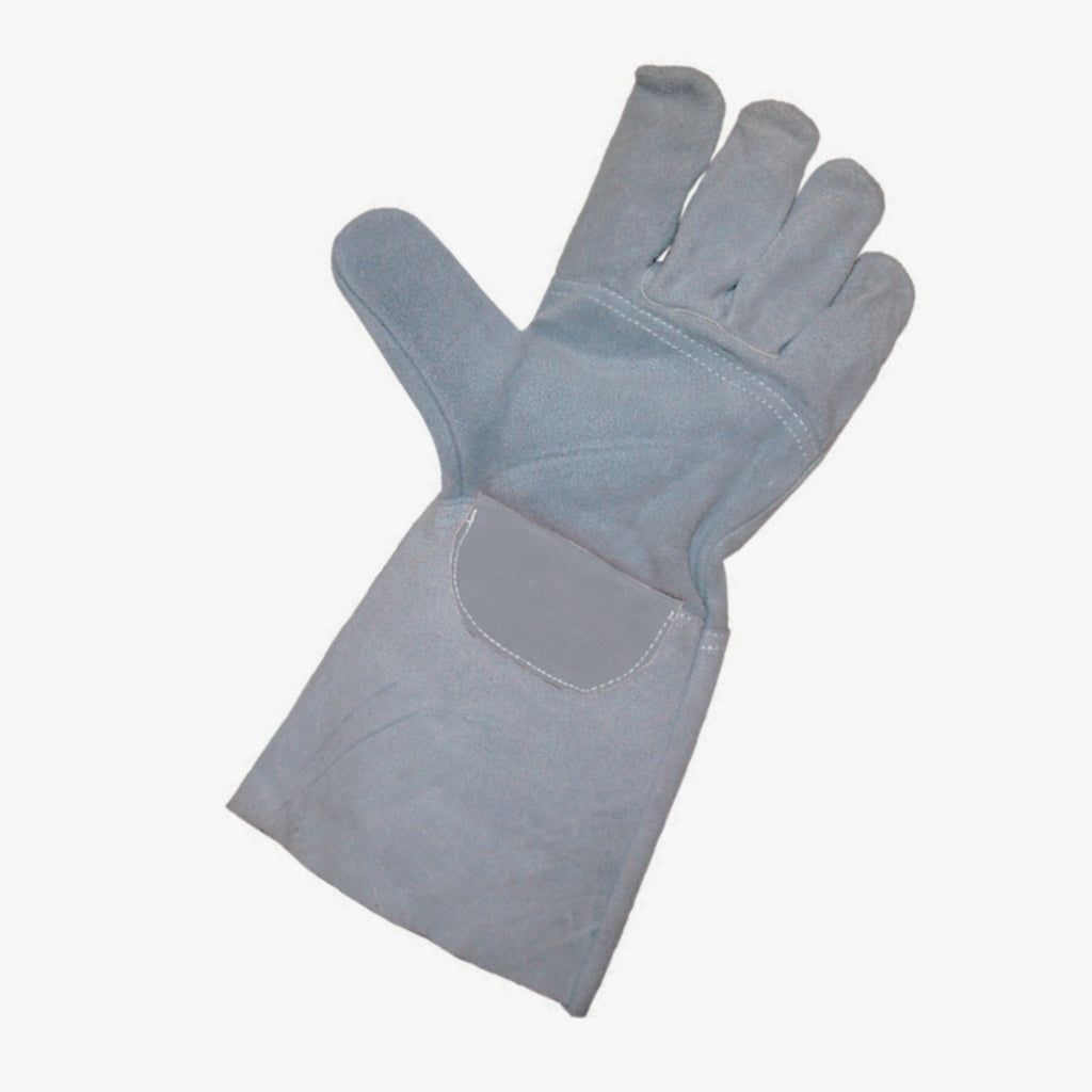 Pelle crosta bovina. Palmo rinforzato. Manichetta da cm. 15. Lunghezza 350mm.