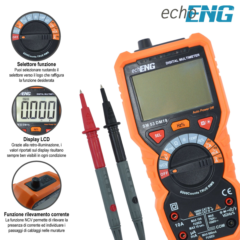 Il Multimetro Digitale Automatico echoENG SM 53 DM19 è lo strumento ideale per elettricisti, tecnici e hobbisti che cercano precisione, sicurezza e funzionalità avanzate in un unico dispositivo compatto.