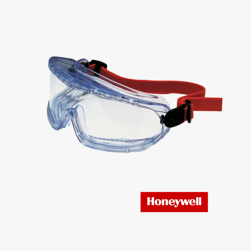 Occhiale a mascherina con ventilazione indiretta e trattamento antiappannamento. Lente in policarbonato incolore. Bardatura di poliestere e gomma naturale, agganciata su perni ruotanti. Protezione da UV.