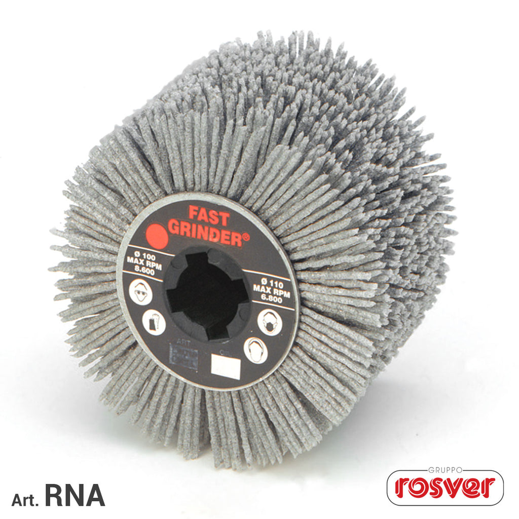 Ruote in filo di nylon abrasivo per rusticare il legno (evidenziando la venatura), per pulire metalli.