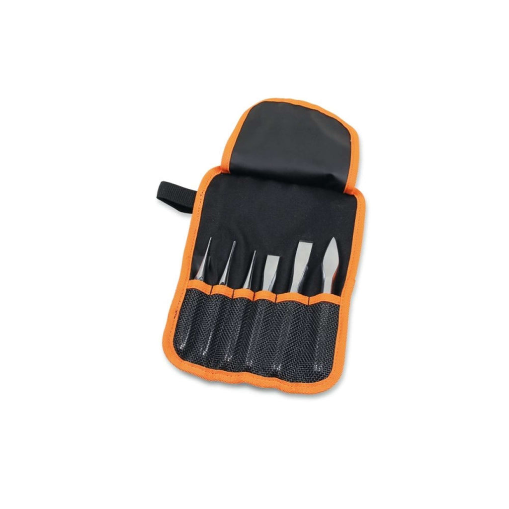 Serie di 2 punzoni, 1 bulino, 2 scalpelli piatti e 1 ugnetto in busta